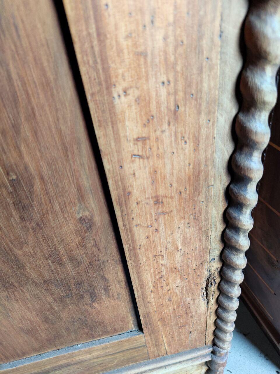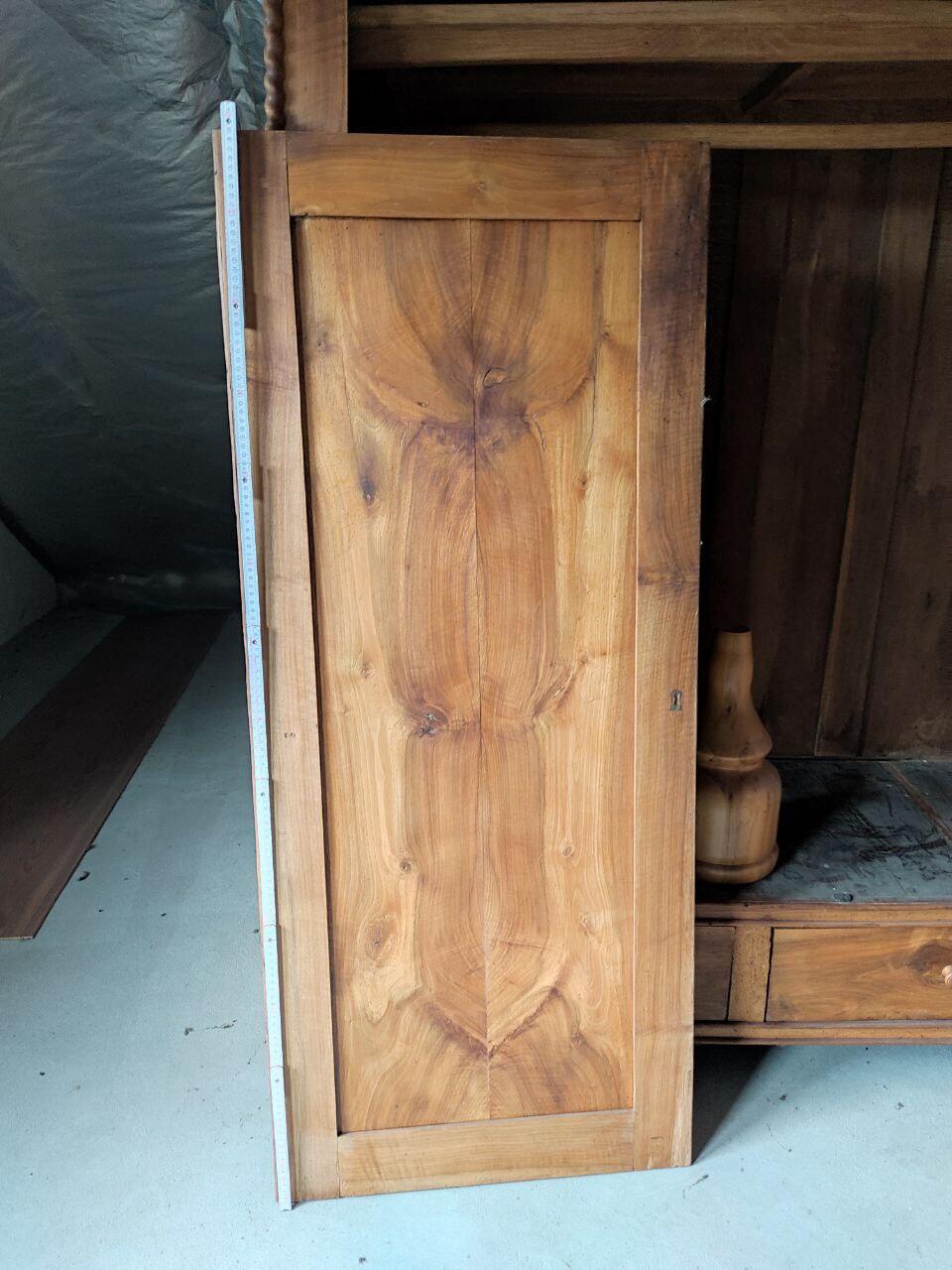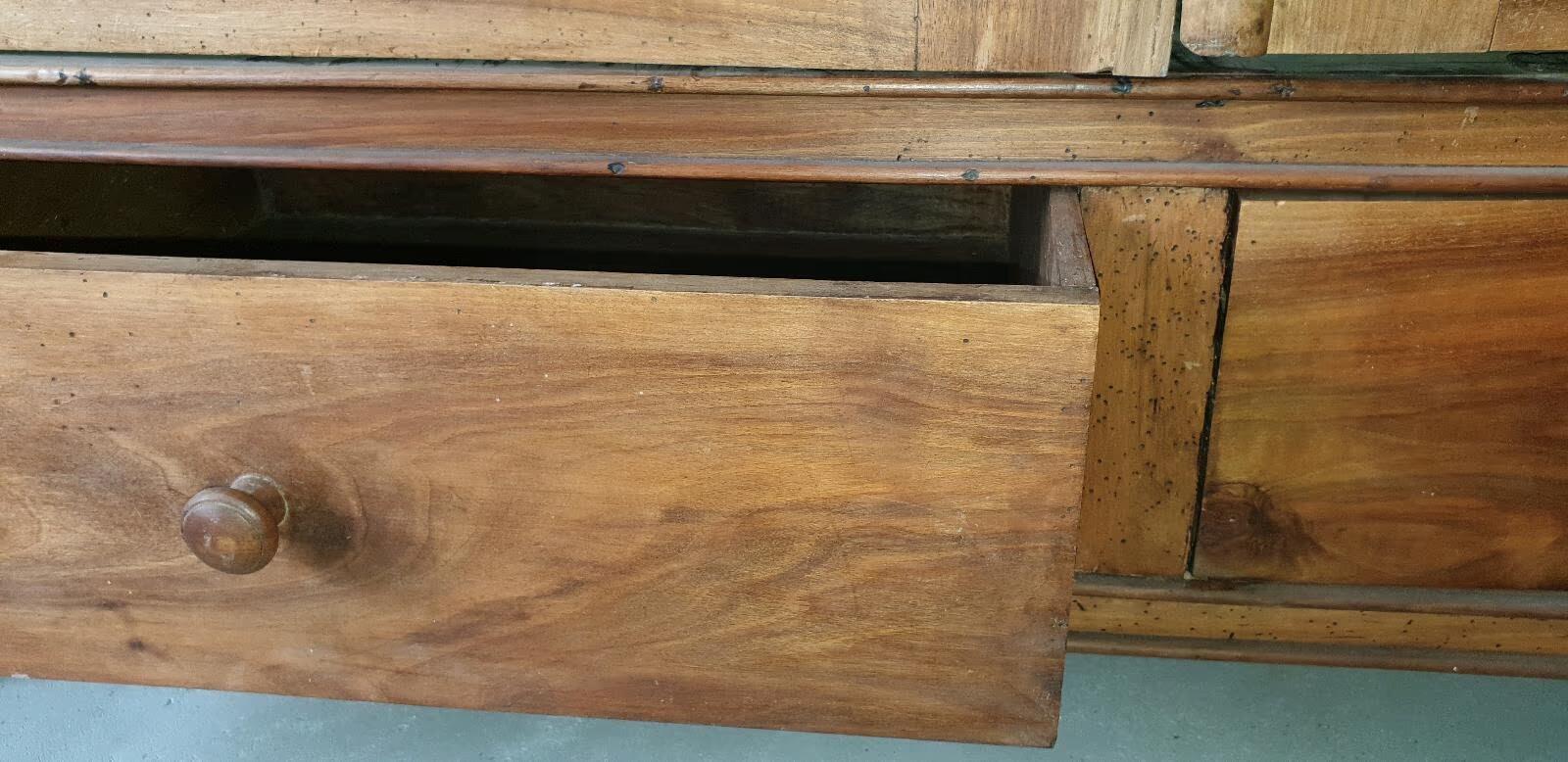 Der Schrank hat alte Spuren von Holzwürmern, da er aus altem Holz gebaut wurde, welches aber entsprechend behandelt wurde. Die letzten 20 Jahre (oder länger), stand er nur trocken auf dem Dachboden.