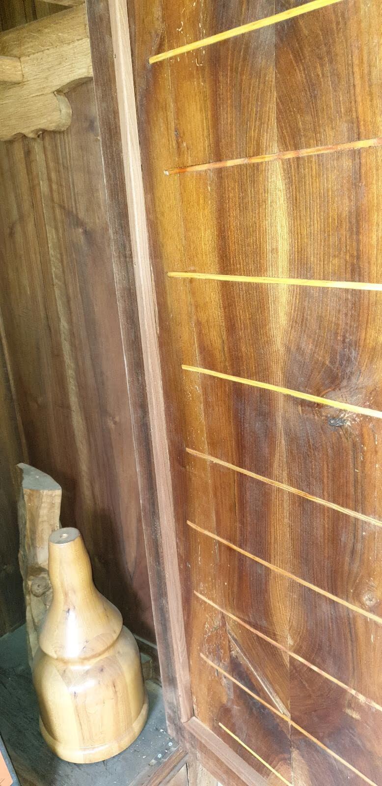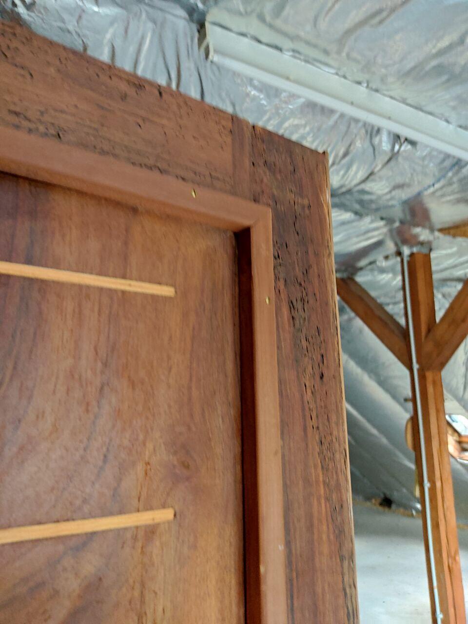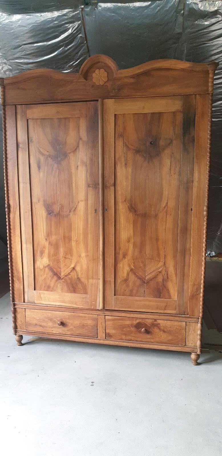 Der Schrank hat alte Spuren von Holzwürmern, da er aus altem Holz gebaut wurde, welches aber entsprechend behandelt wurde. Die letzten 20 Jahre (oder länger), stand er nur trocken auf dem Dachboden.