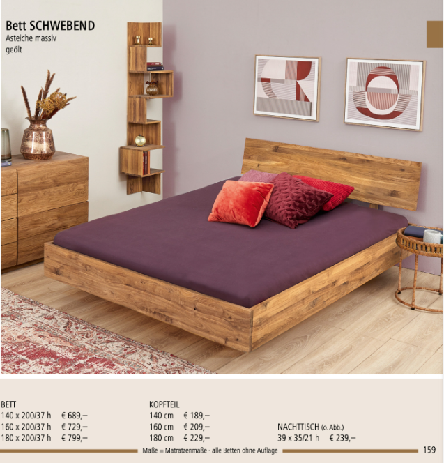 Das Bett wurde nur 2 Jahre genutzt und wurde dann eingelagert. Es ist in einem sehr guten Zustand. Das Bett ist vom Möbelhersteller RS-Möbel, Modell “Schwebend” Asteiche geölt inklusive Kopfteil und Nachttisch die Matratze ist von Ikea (Modell Hesseng). Beide Rechnungen sind noch im Orginal vorhanden (aus dem Jahr 2018), Orginalkosten lagen bei 1600€