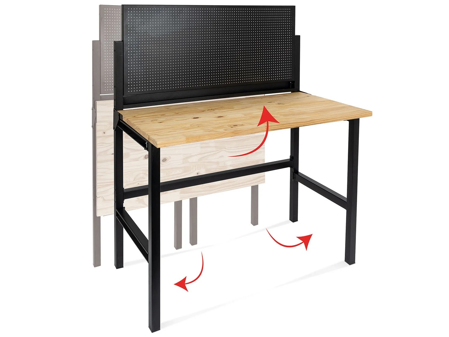 Werkbank klappbar, B 121 x H 142 x T 65cm, bis zu 100 kg belastbar, inkl. Set aus 10 Haken für die Lochwand.