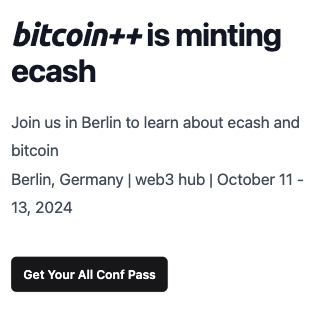 Ich verkaufe hier einen All Conf Pass für die btc++ ecash conference in Berlin, da ich einen übrig habe. Ticket wird digital als PDF verschickt. Gerne per Telegram oder Email.