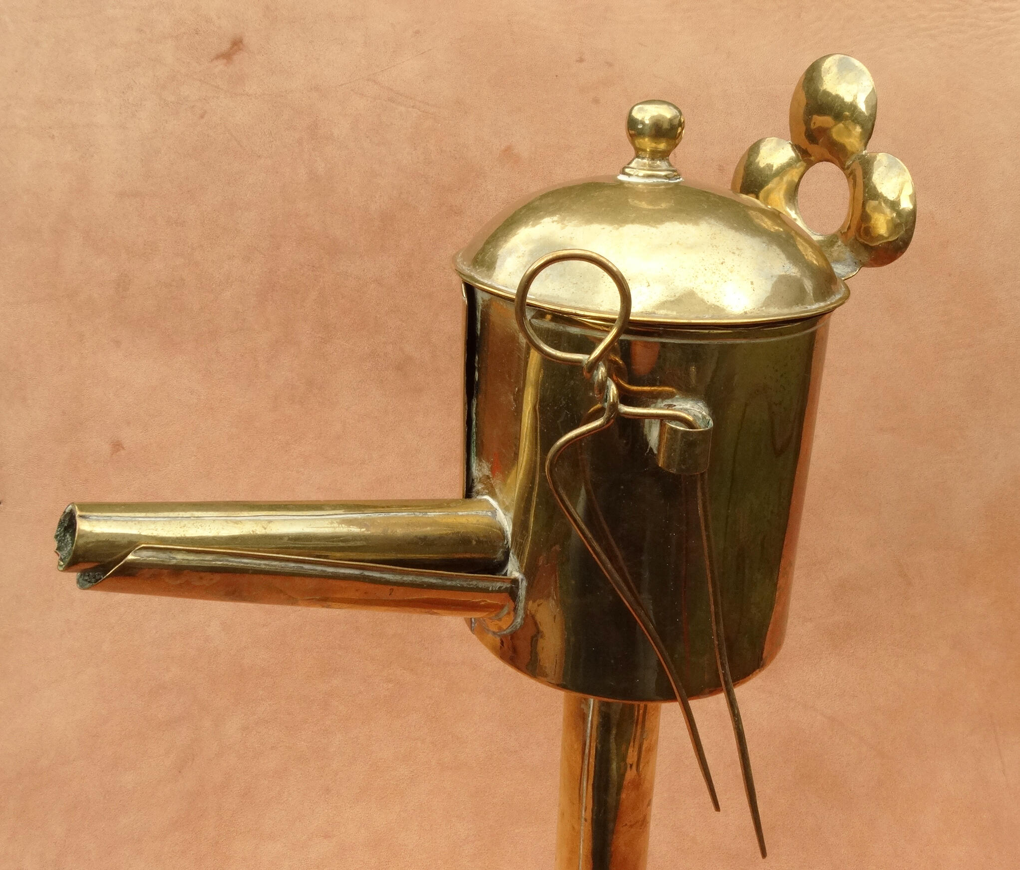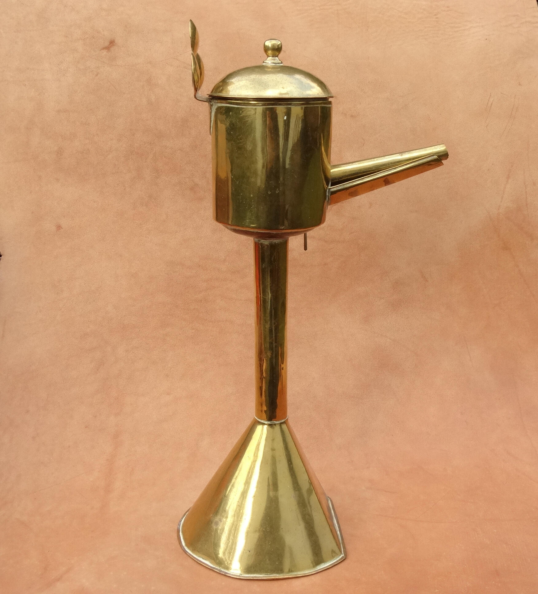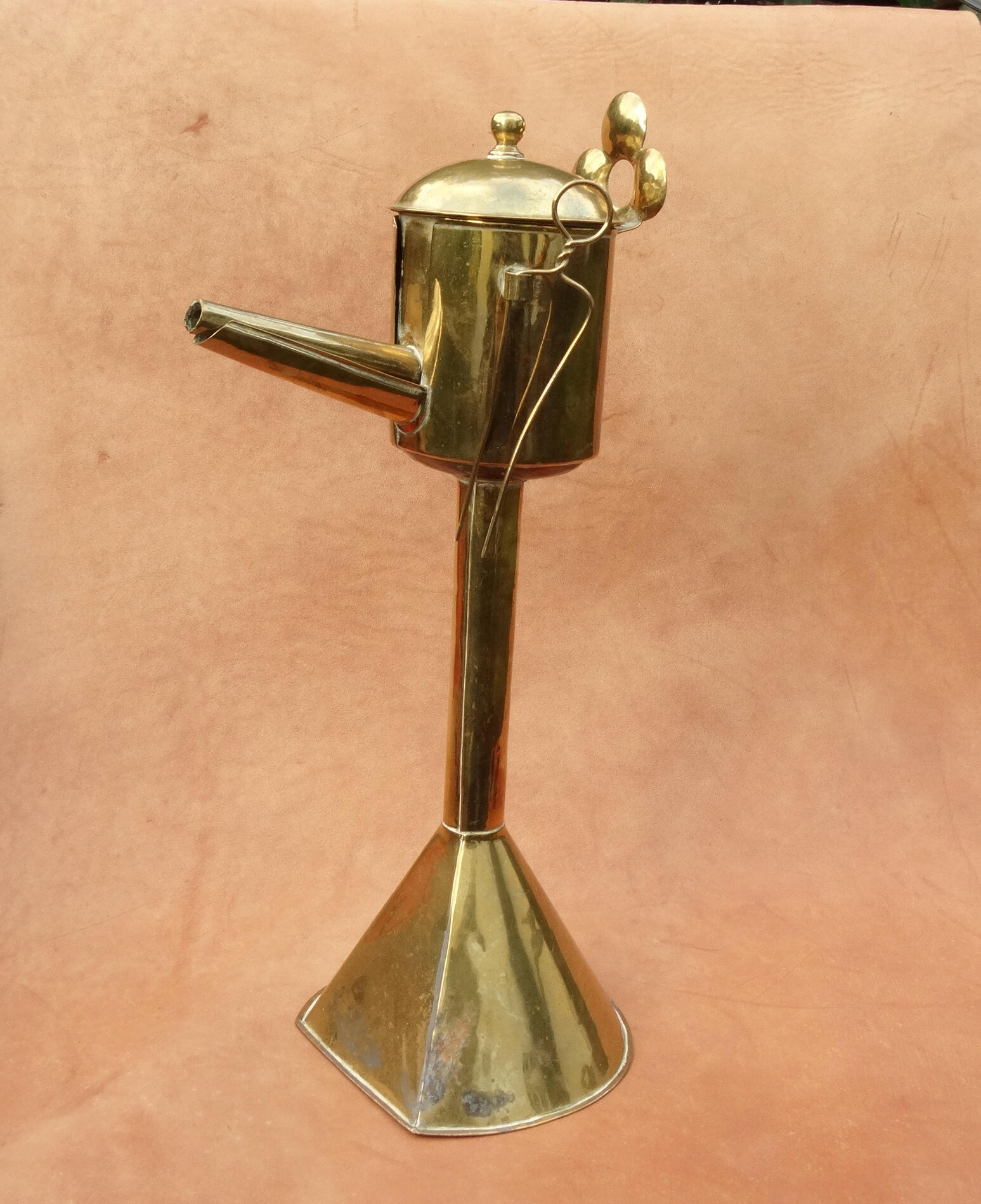 Große Messinglampe aus der Zeit des Walfangs. Wal-Tran diente im 19. Jahrhundert vielen Bewohnern der Meeresküsten, aber auch auf Segelschiffen, als günstiger Brennstoff zur Beleuchtung. Ursprünglich als Wandlampe konzipiert wurde dies Exemplar zeitgenössisch zur Standlampe für den Tisch umgebaut. Dafür wurde der Fuß verändert/geöffnet, also neu verlötet und mit Sand beschwert, um die Stabilität zu erhöhen.