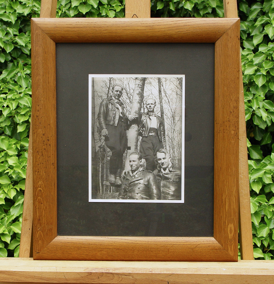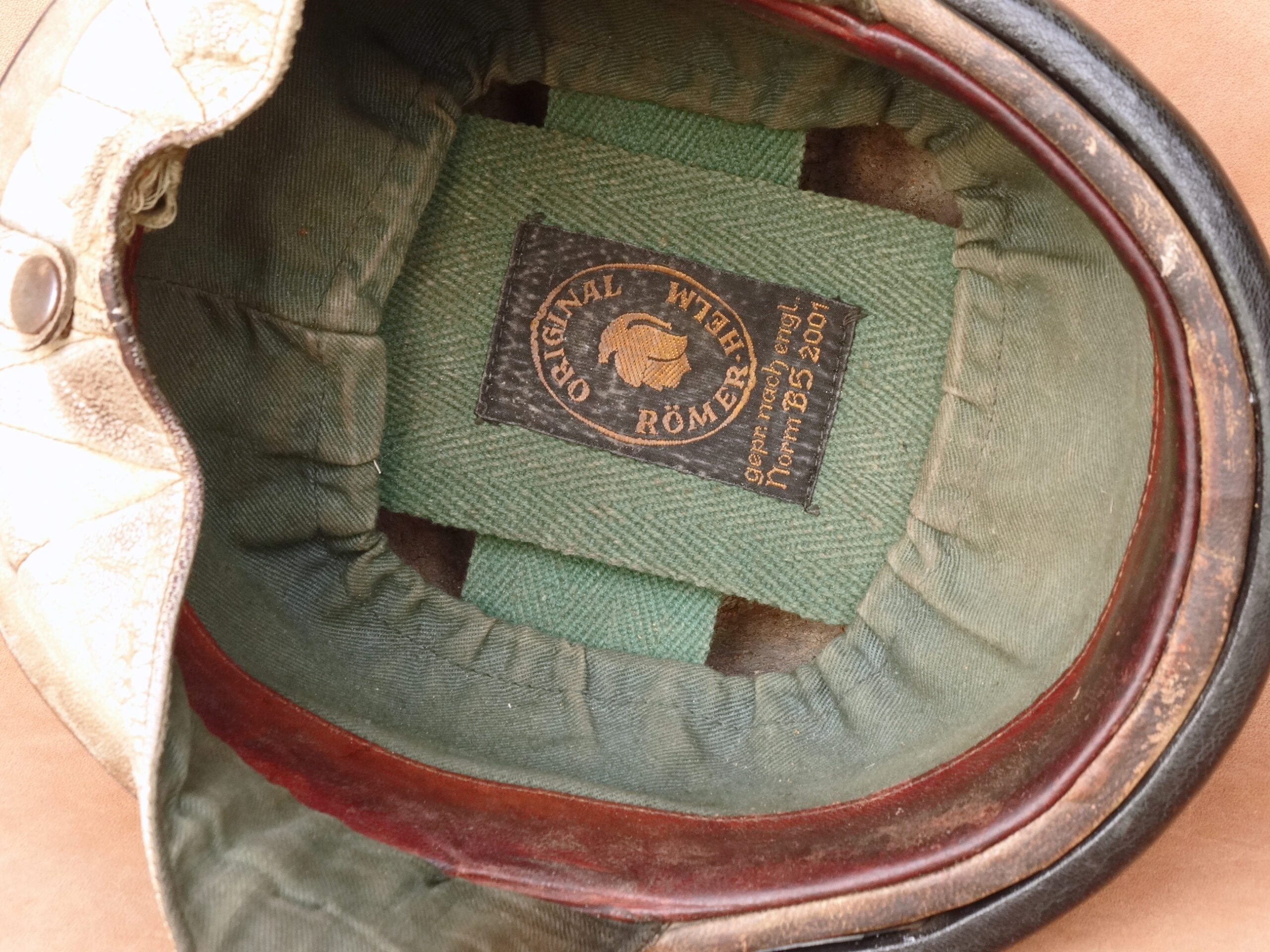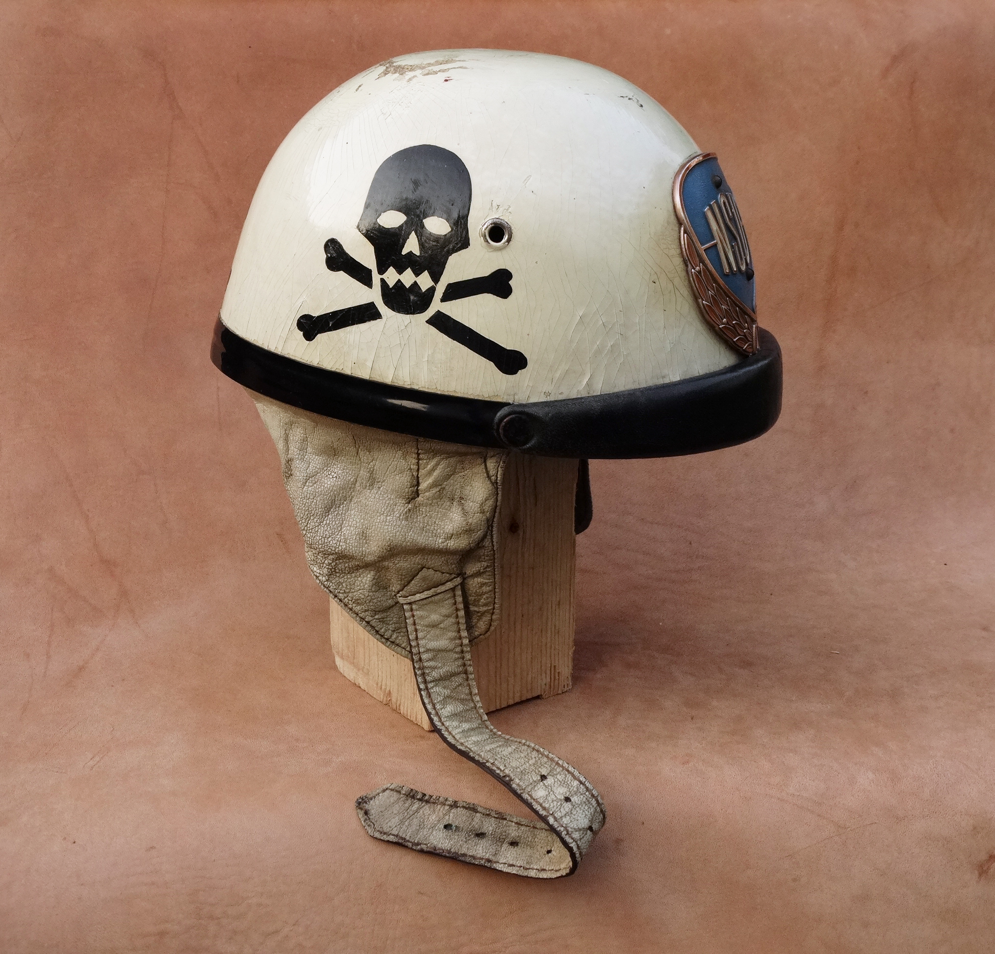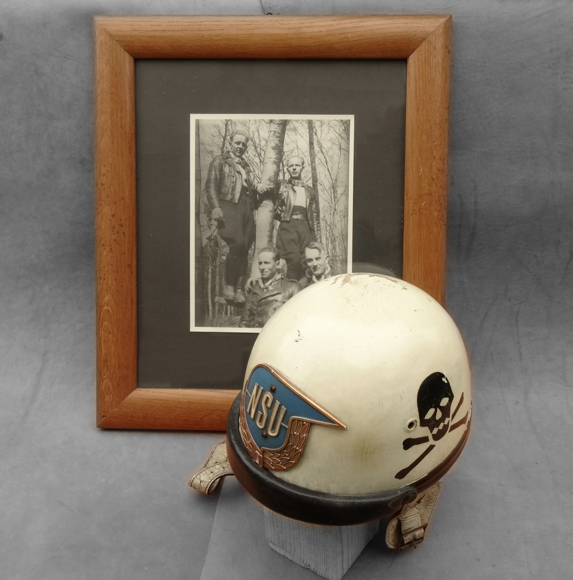 Extrem seltener Helm aus der Frühzeit der Motorradrocker-Bewegung (1%er), in der man noch keine Big Twin-Harleys fuhr, sondern NSU, BMW oder Horex. Eine sog. „Kutte“ trugen die damaligen Gruppierungen noch nicht, da es noch keine festen Clubstrukturen gab. Garantiert originales Exemplar! Dazu ein gerahmtes Gruppenfoto des einstigen Trägers. Helm der Firma Römer, in deutlich gebrauchtem Zustand mit Patina, komplett mit Kinnriemen, aufgeschraubten großem NSU-Emblem aus Metall und drei aufgemalten Totenköpfen. Gewicht des Helms: 624 Gramm. Größe: 56 Dazu ein originales Foto, das während der Deutschen Motorrad-Straßenmeisterschaft („Eilenriede-Rennen“) im Jahre 1936 aufgenommen wurde. Noch in der ungeöffneten originalen Eichenholz-Rahmung. Unter Glas gerahmt. Maße des Fotos: 24 x 18 cm. Rahmenmaß: 45,5 x 38,5 cm. Auf der Rückseite der Rahmung eine Widmung. Foto in sehr gutem Zustand. Das Eilenriede-Rennen war ein Motorradrennen in Hannover seit 1924. DHL-Versand: 7 Euro. EU: 18 Euro.