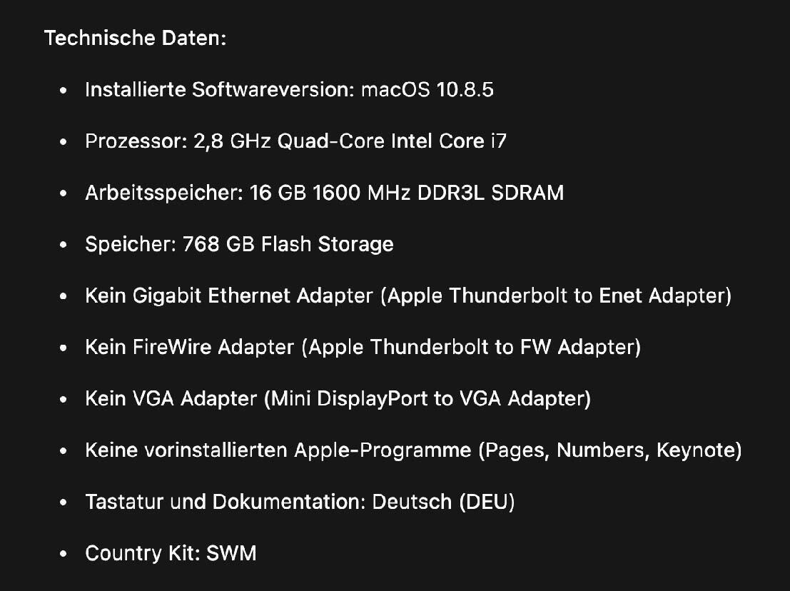 Voll funktionsfähig, ein Eigentümer. Original Kaufbeleg von Apple vorhanden. Gerät ist laut Apple als veraltet eingestuft, jedoch problemlos nutzbar. Akku wurde einmal bei einem autorisierten Apple-Händler ausgetauscht (Rechnung verfügbar). Wird ohne Passwort und ohne FileVault übergeben – sofort einsatzbereit.