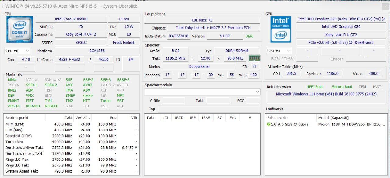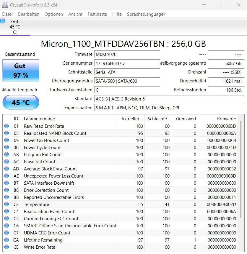 256 GB SSD (Sata 2,5 Zoll Slot frei)