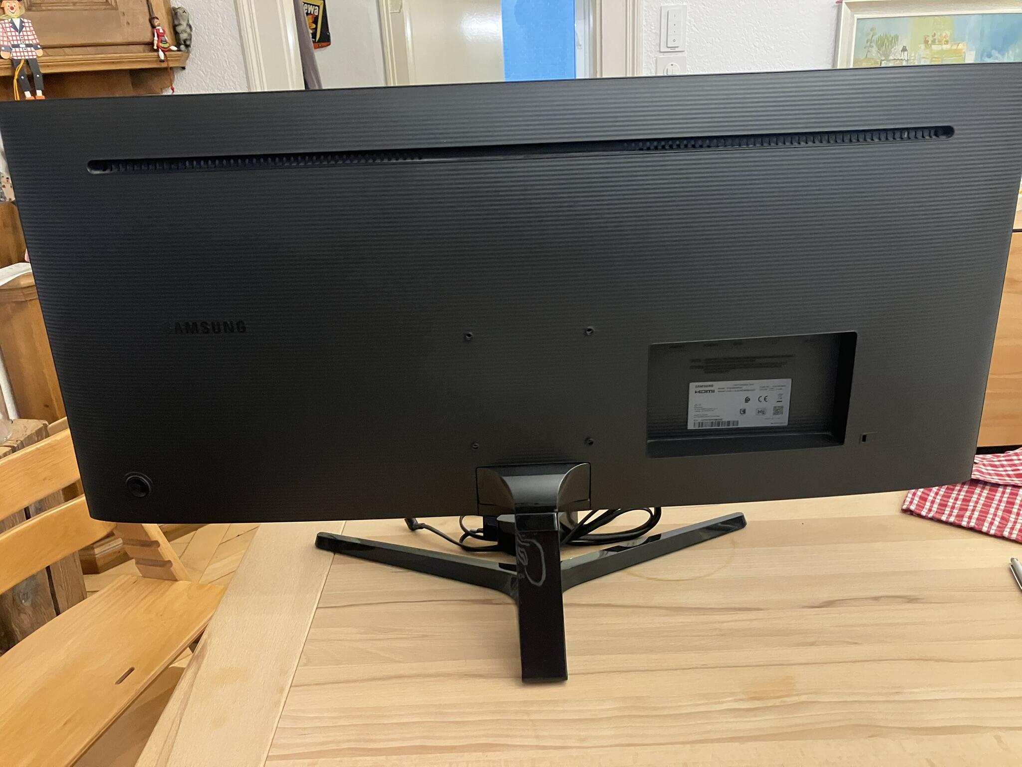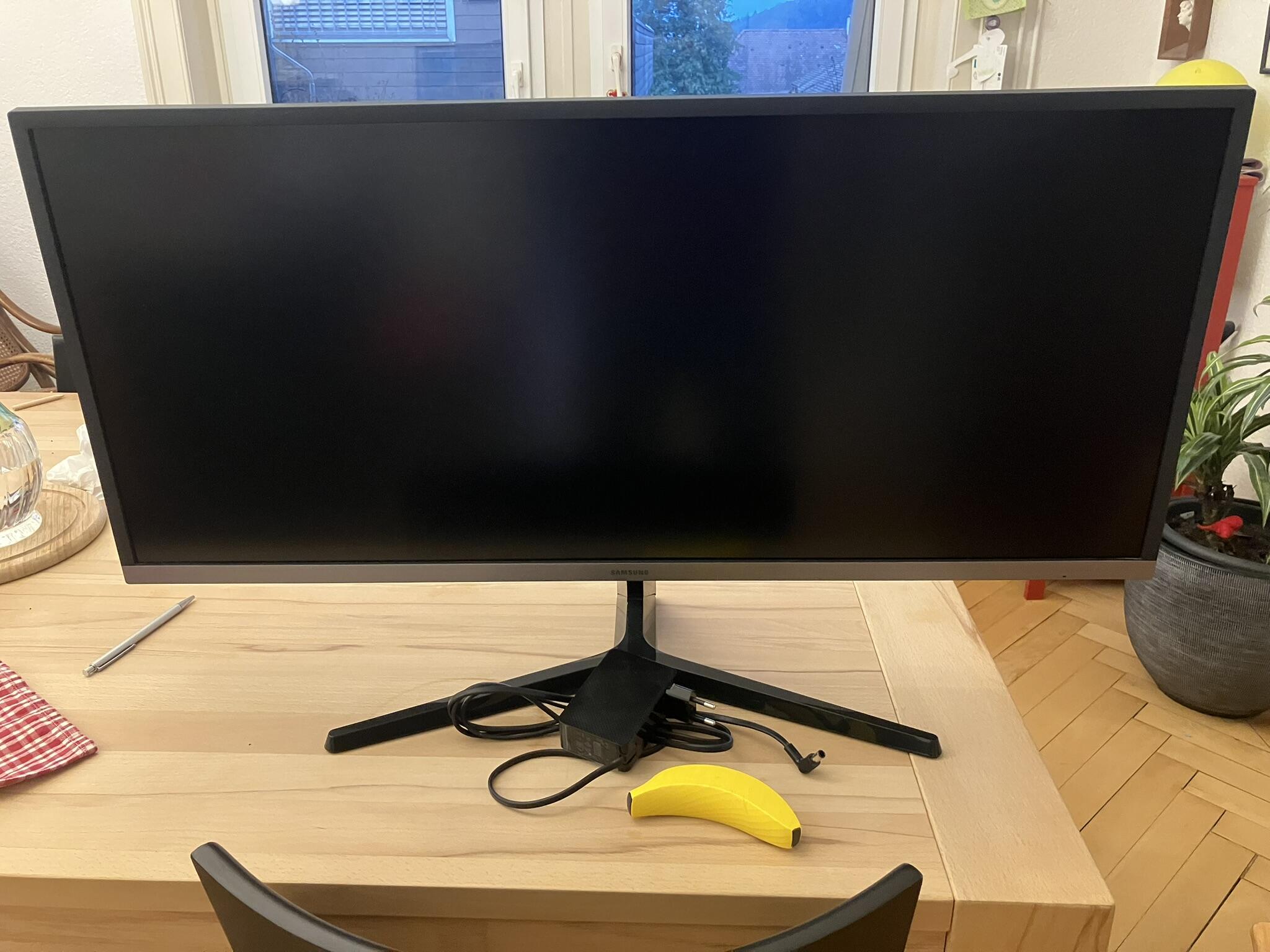 erkaufe meinen schön breiten Monitor, da er nicht für Bildbearbeitung geeignet ist. Er ist nicht farbtreu, aber sonst sehr Zuverlässig: Er leistete mir, seit Home-Office zum Thema wurde, gute Dienste und ich wünsche mir für ihn ein neues zu Hause, wo er weiter gut gebraucht wird. Muss in der Zentralschweiz abgeholt werden, habe seine Schachtel weggeworfen. – Ultra WQHD Monitor, 34 Zoll, 3.440 x 1.440 Pixel, 21:9 Format, VA-Panel – Energieeffizienzklasse A – Kontrast 3.000:1, Helligkeit 300 cd/m² – HDMI (2x), Display Port (1x), Kopfhörer (1x), Wandmontage (VESA 100×100) Banana for scale!