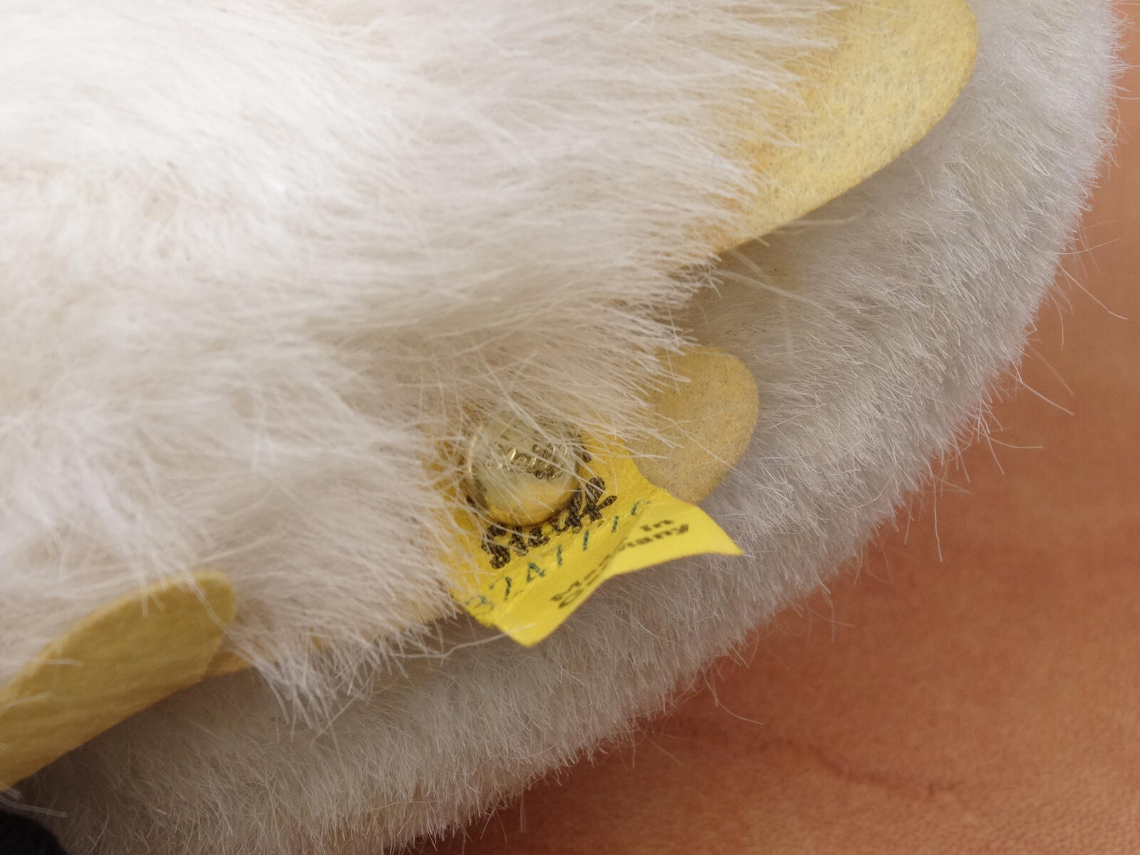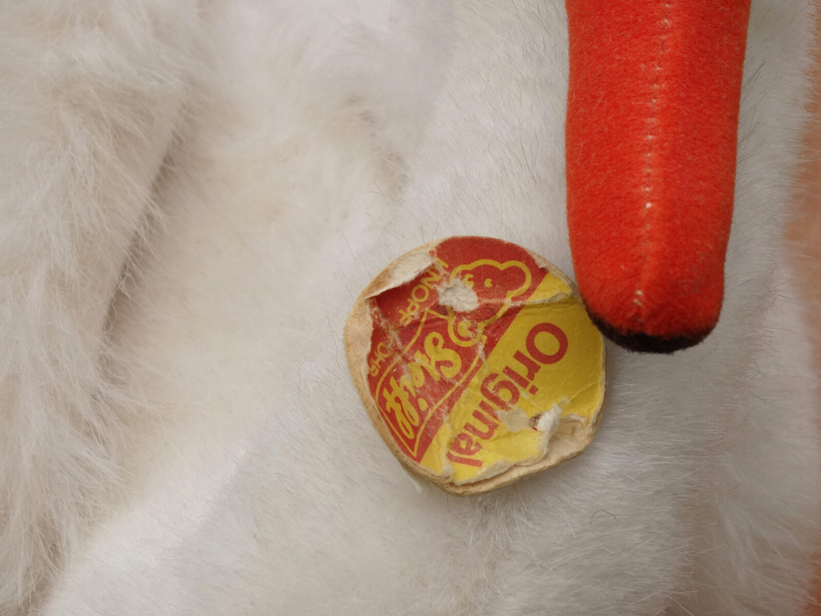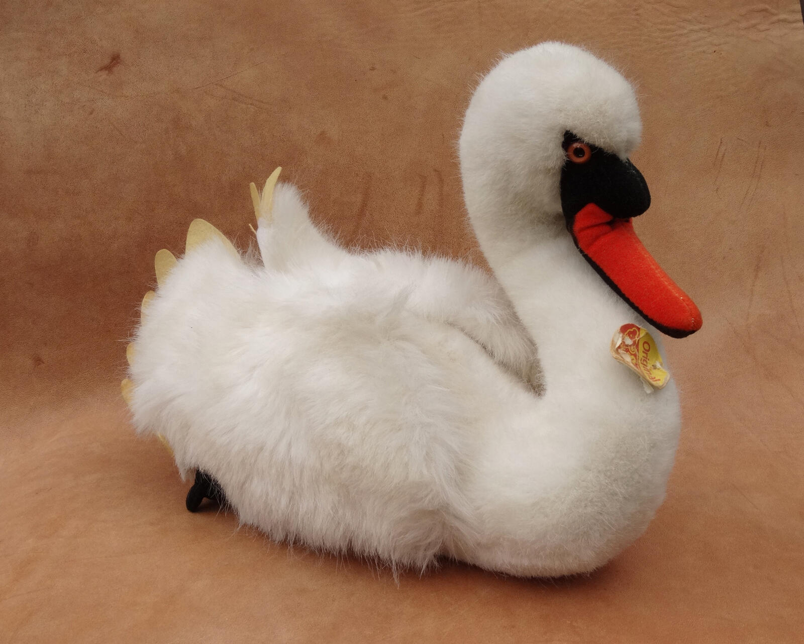 Traditioneller Steiff Mohair Stoff, Schnabel aus rotem Samt.