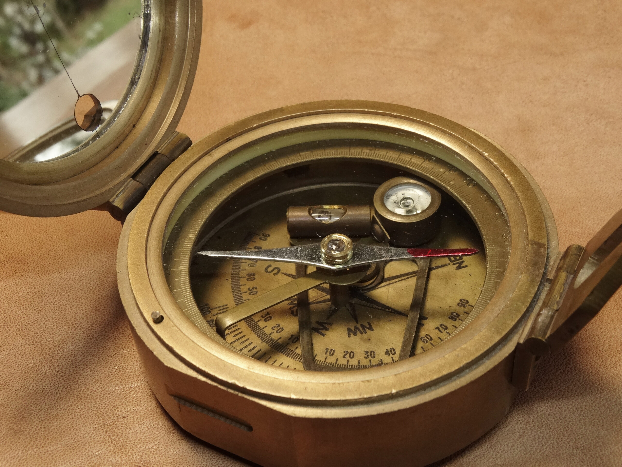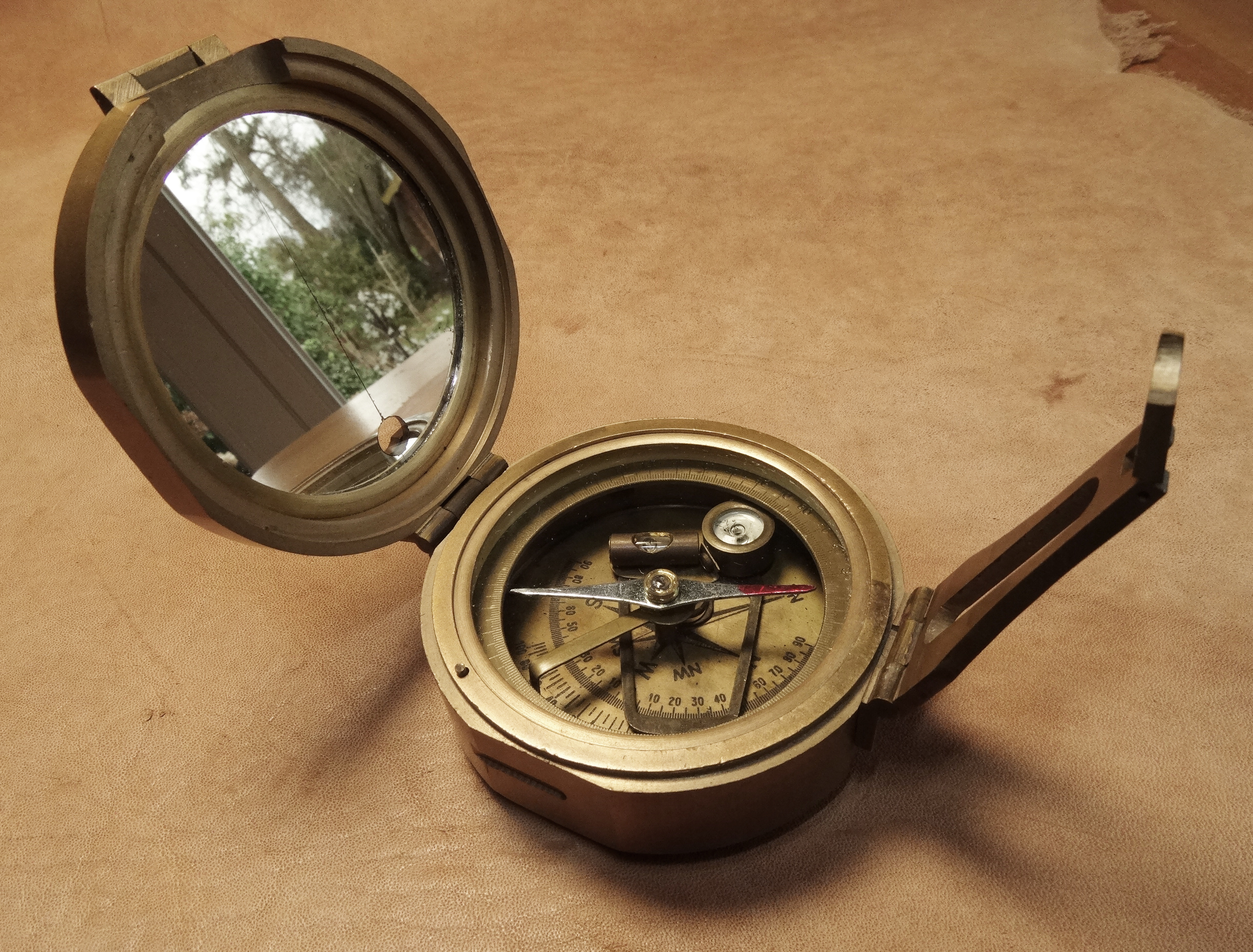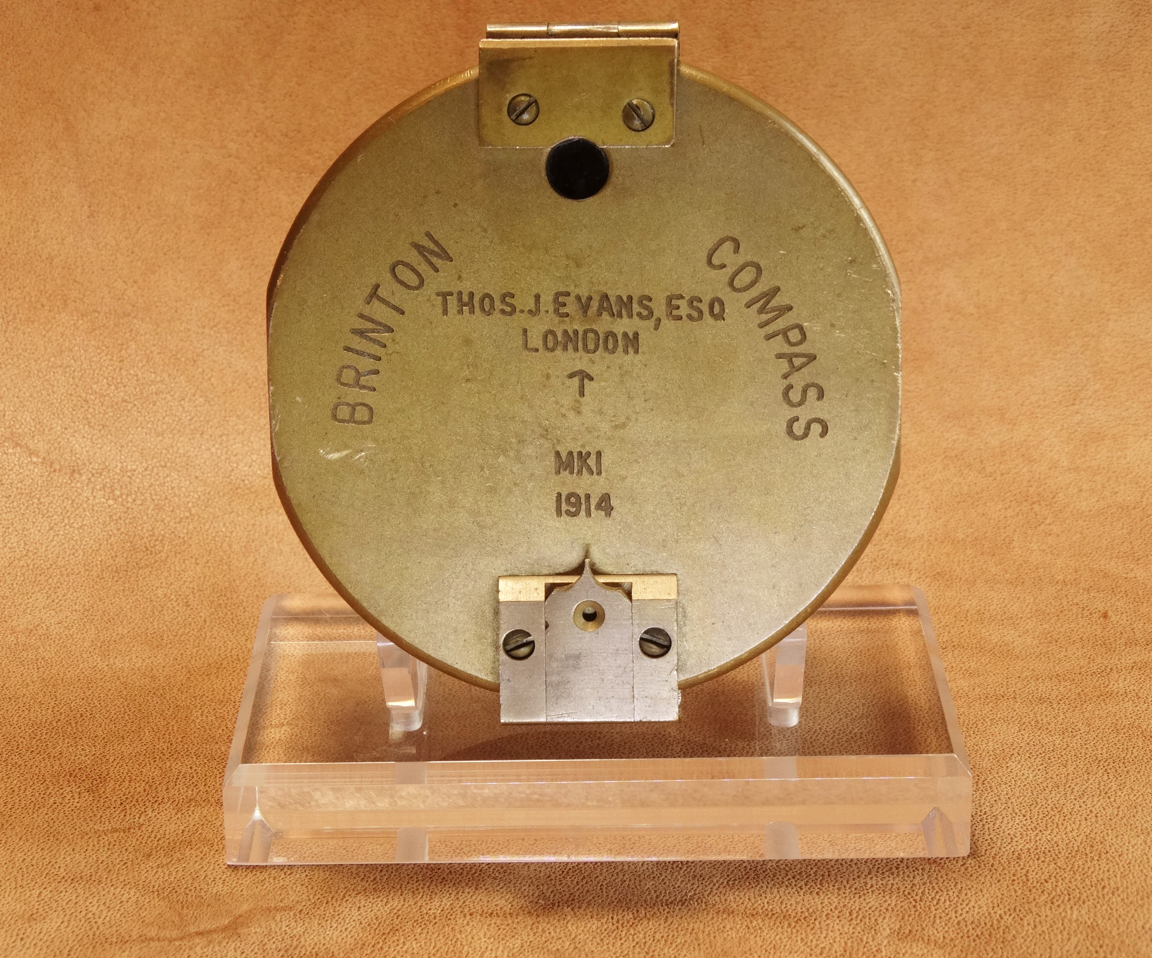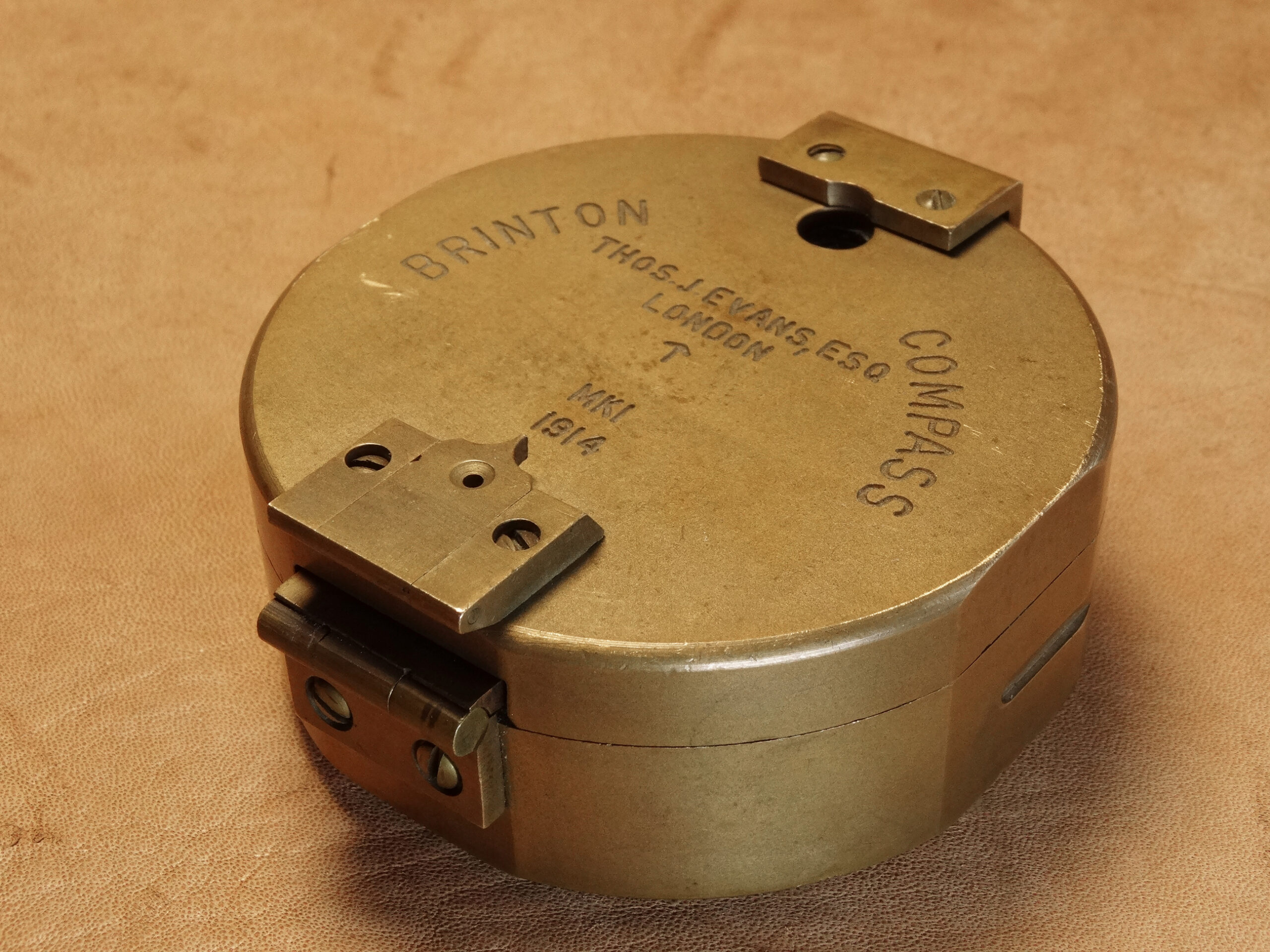 Schwerer britischer Militärkompass (Typ Brinton). Auf dem Deckel die Typenbezeichnung, der Hersteller „Evans London“ sowie die Markierung für britische militärische Ausrüstungsgegenstände mitsamt Datum (Pfeil plus MK1 1914).