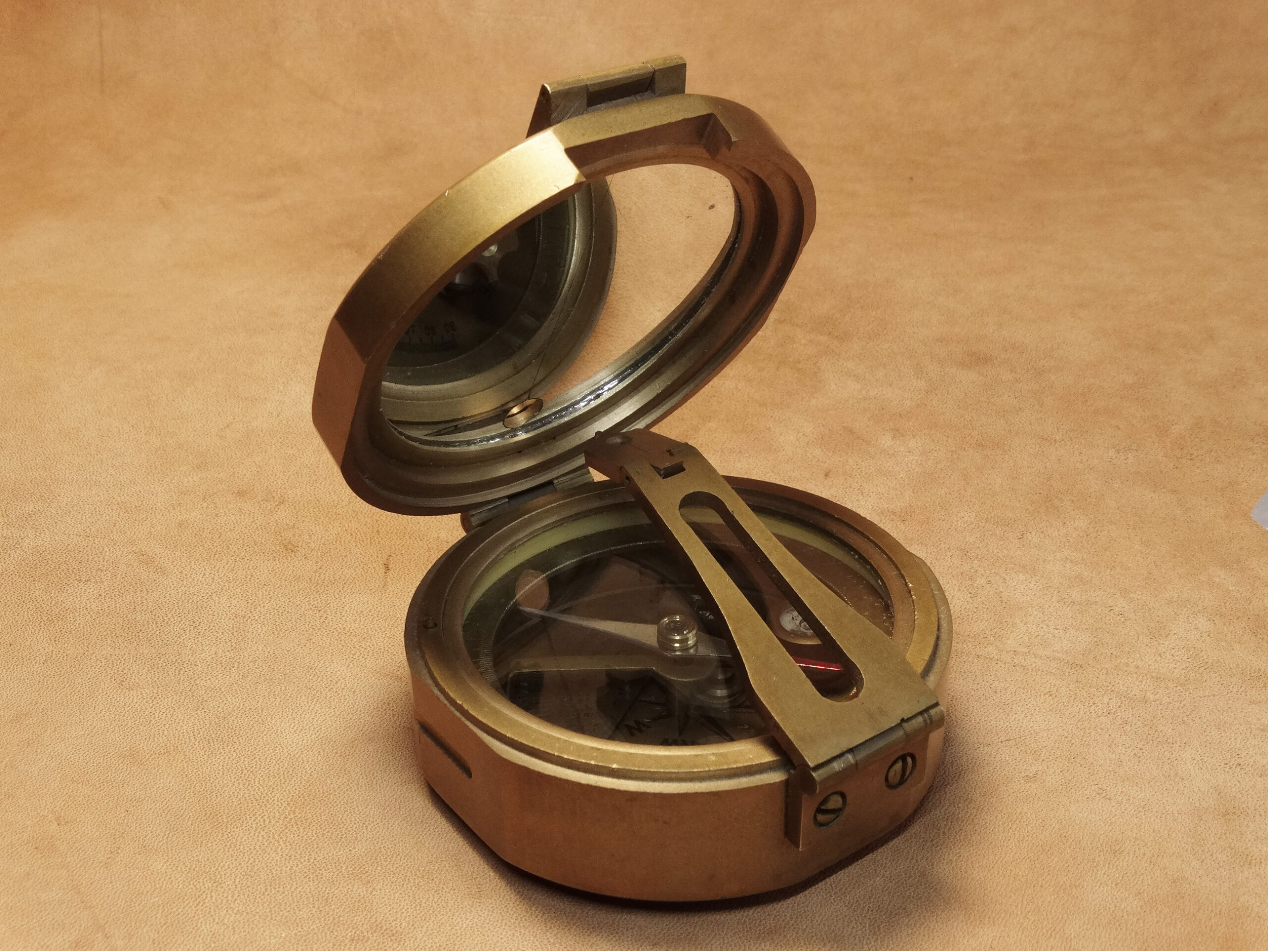 Sehr schön verarbeitetes und voll funktionsfähiges Dekorationsstück in bester Erhaltung! Übrigens wird die Kompassnadel beim Schließen des Deckels automatisch gesichert. Glas und Spiegel intakt. Auch zum Navigieren noch gut geeignet, wenn auch recht schwer. Leichte Altersspuren.
