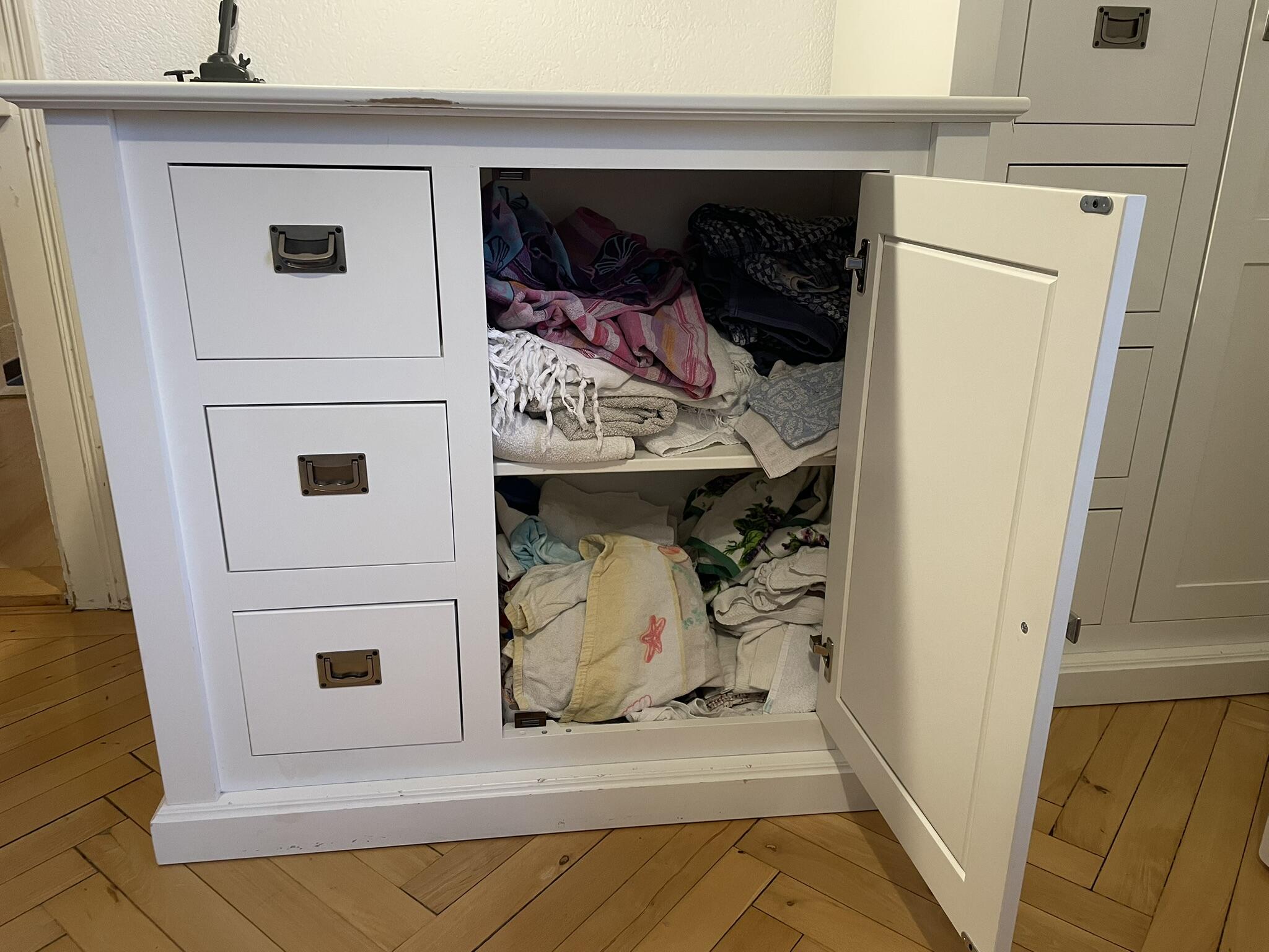 Die Wickelkommode hat 3 Schubläden und ein Tablar. Hier kann später die Verlängerung abgenommen werden, so dass man später eine normale Kommode und ein Bücherregal hat.