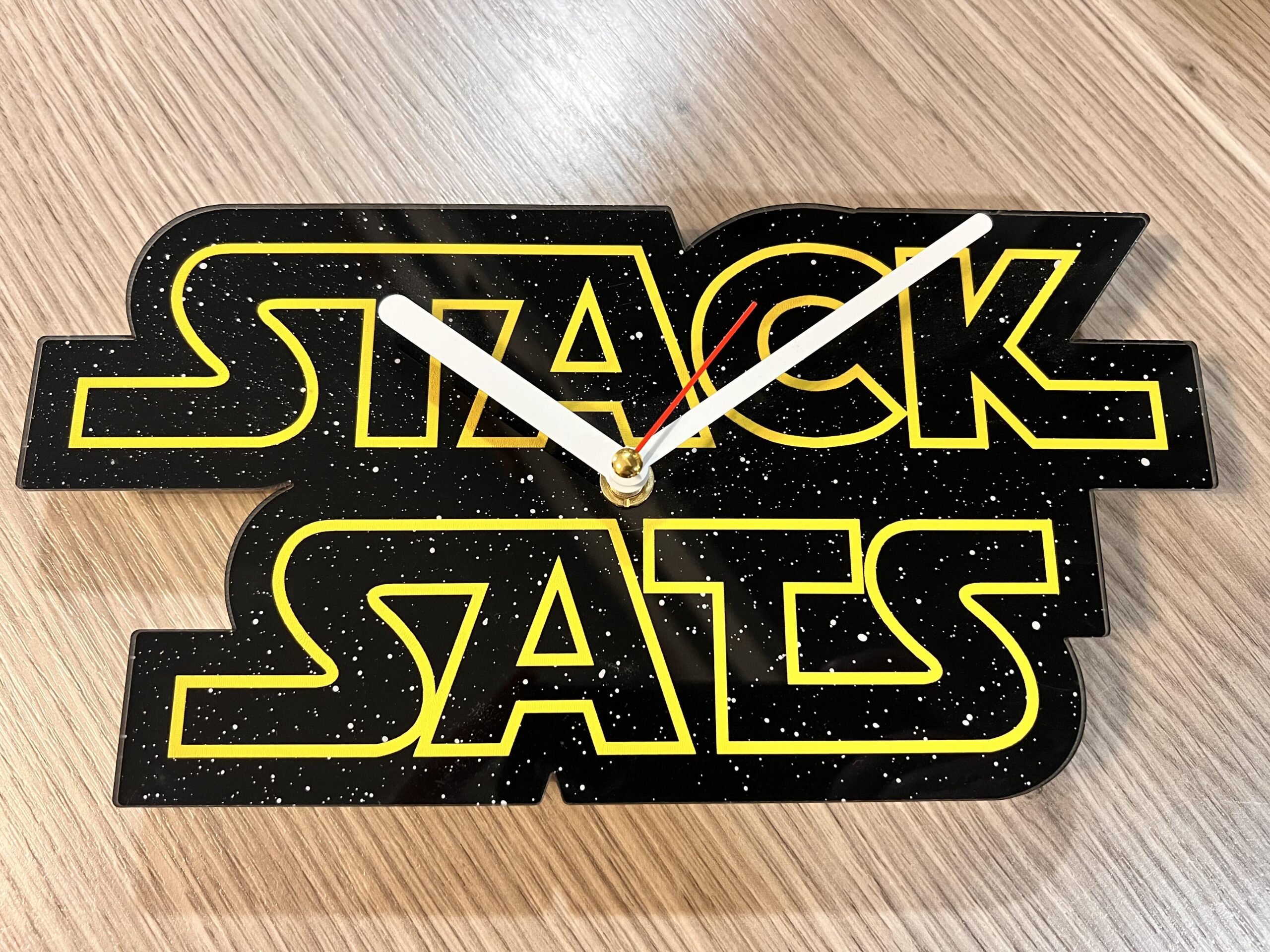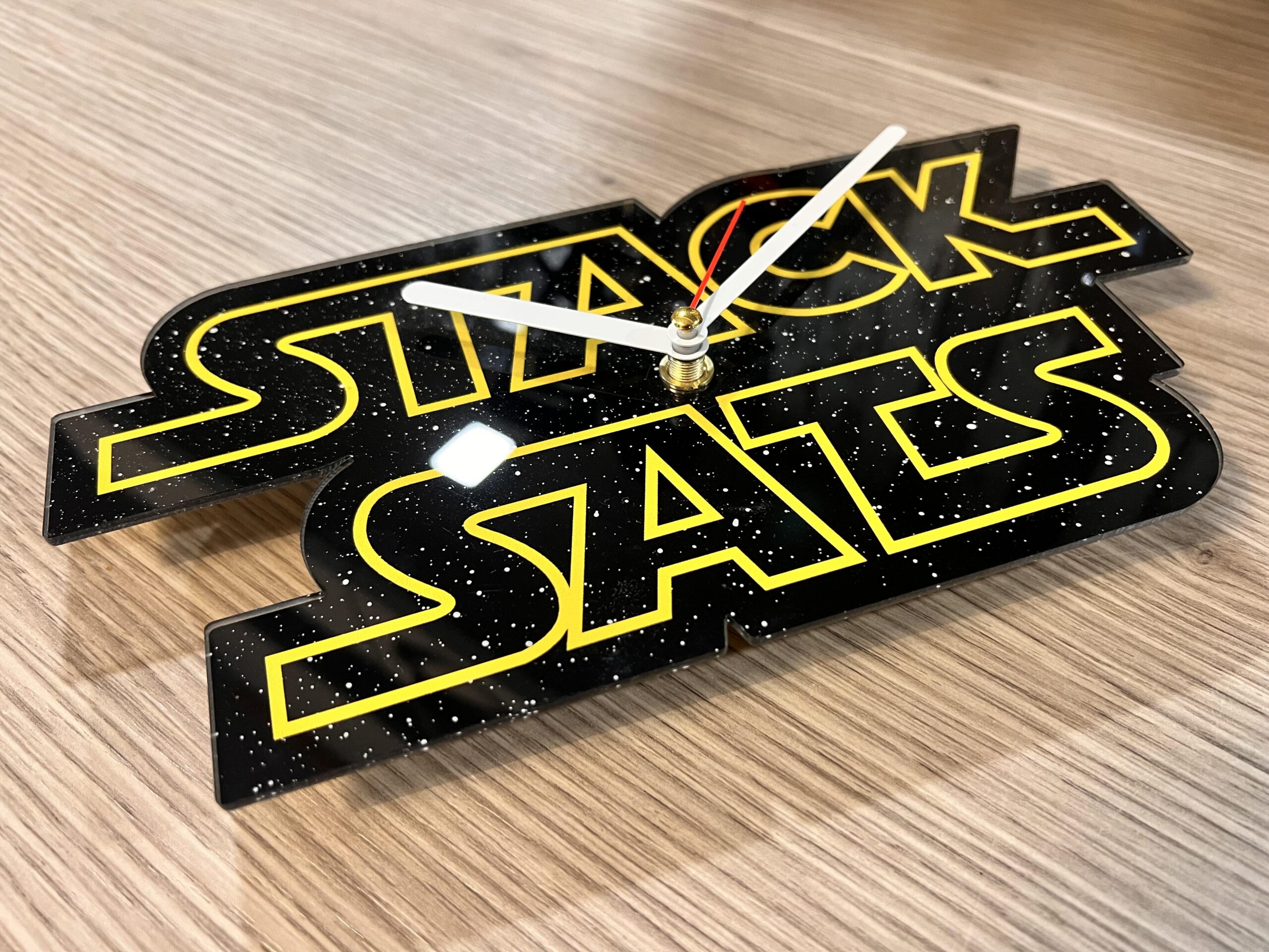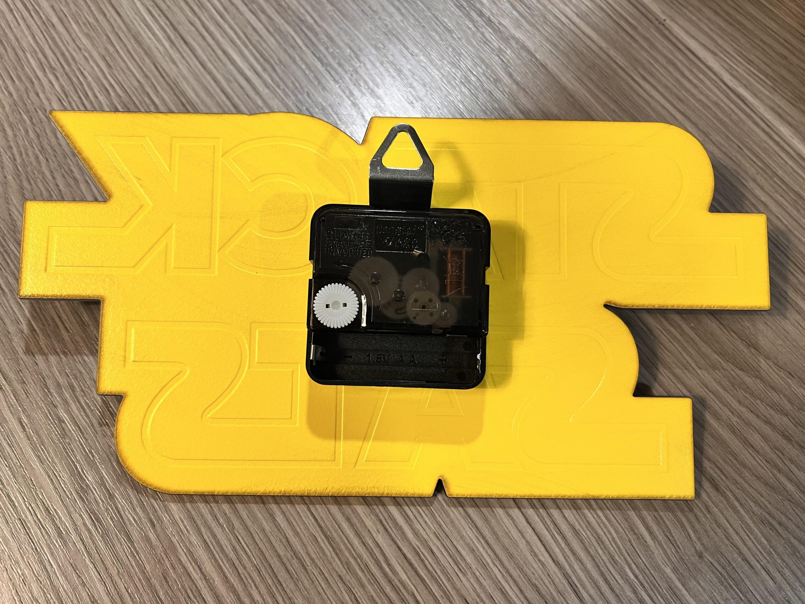 Die Uhr ist 25×12,5 cm groß. Sie ist aus 3mm Plexiglas gefertigt, welches in mehreren Schichten rückseitig lackiert wurde. Verbaut ist ein schleichendes Uhrwerk.