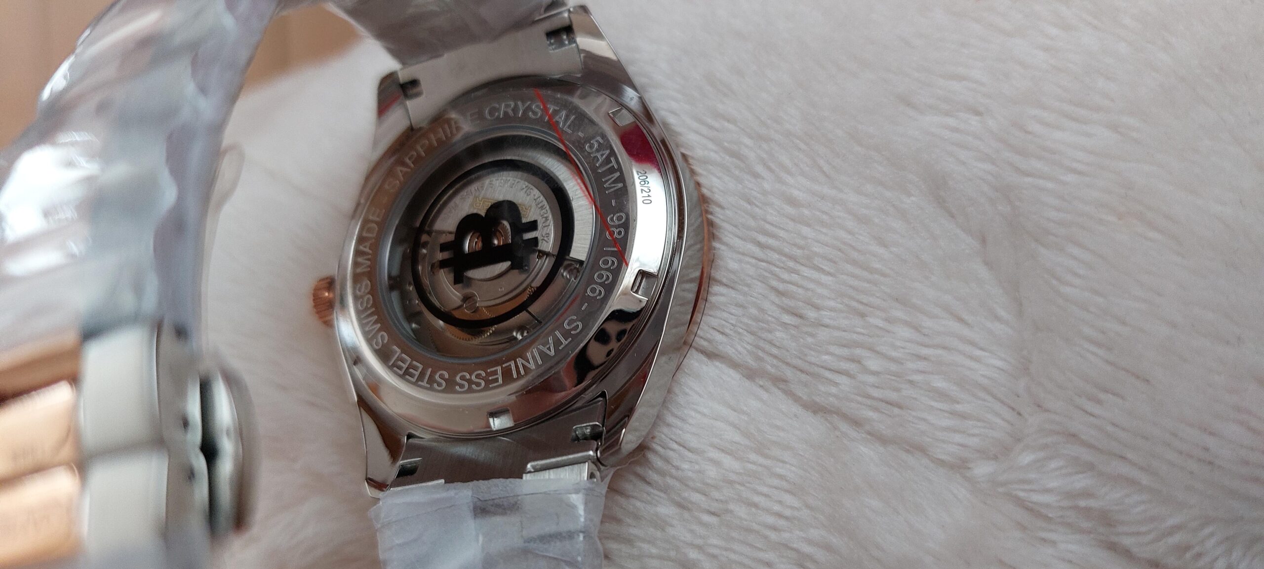 Die Uhr läuft technisch Einwandfrei, ich kann keine Gangabweichung feststellen. An den Schließen der Armbänder sowie am Gehöuse finden sich dem alter gemäße Gebrauchssupren, welche man aber leicht rauspolieren kann. Das Uhrenglas sowie der Glasboden sind Kratzfrei.