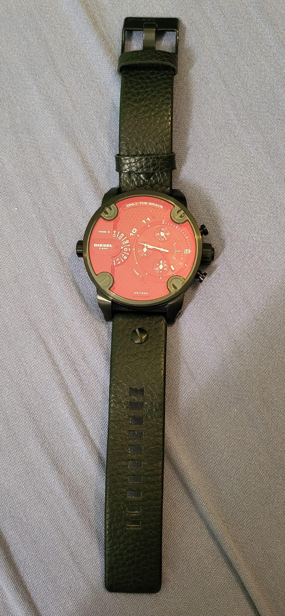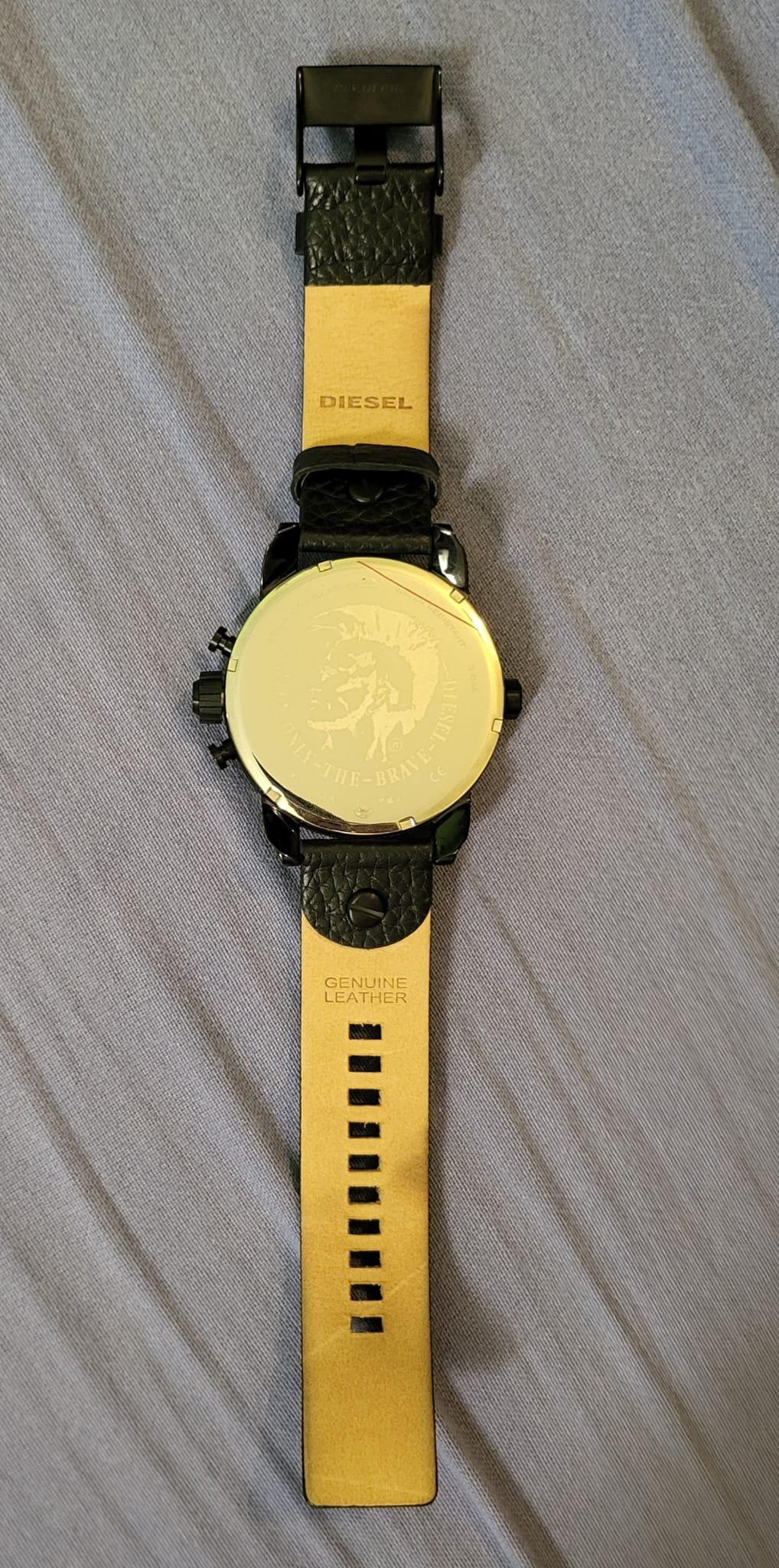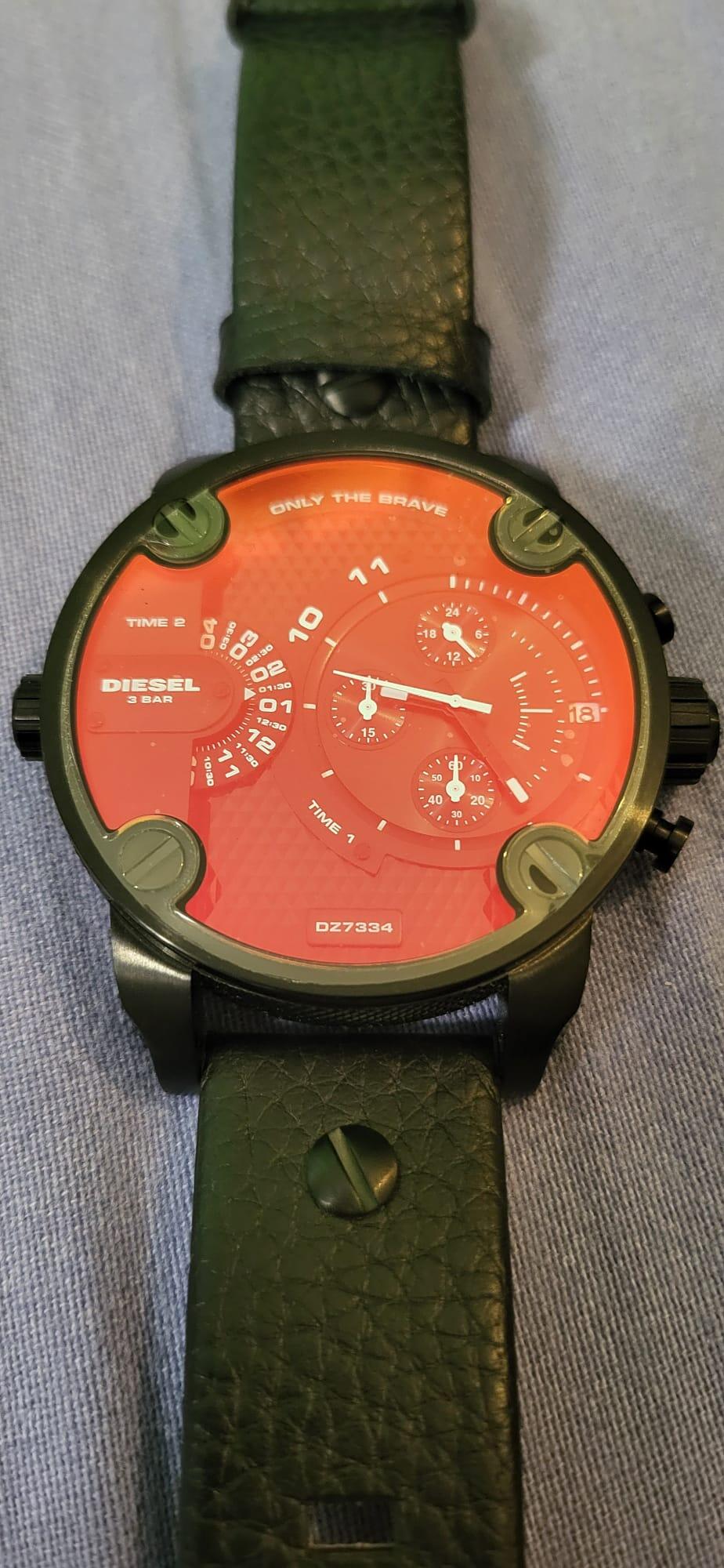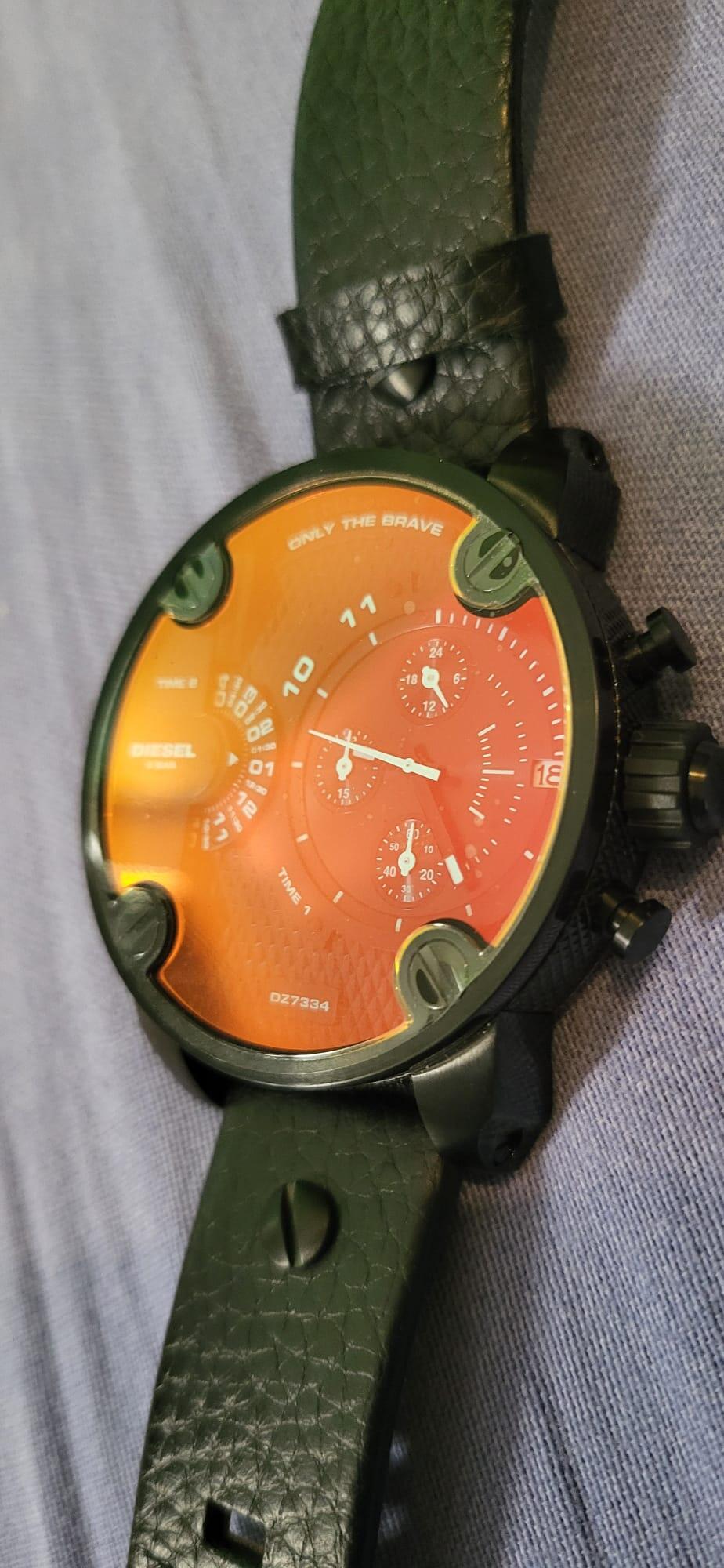 Biete eine neuwertige Diesel-Uhr noch mit der original Schutzfolie auf dem Glas. Sie hat einen Chronografen, eine Datumsanzeige, ein zweites Ziffernblatt mit Stundenanzeige und irisierendes Glas, das je nach Winkel rötlich oder bläulich erscheint. Sie wurde noch nie getragen, allerdings müsste eine neue Batterie rein und ich habe den Originalkarton nicht mehr. Sie würde natürlich sicher verpackt werden und der Versand ist inklusive. Das Armband ist aus Leder.