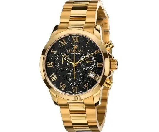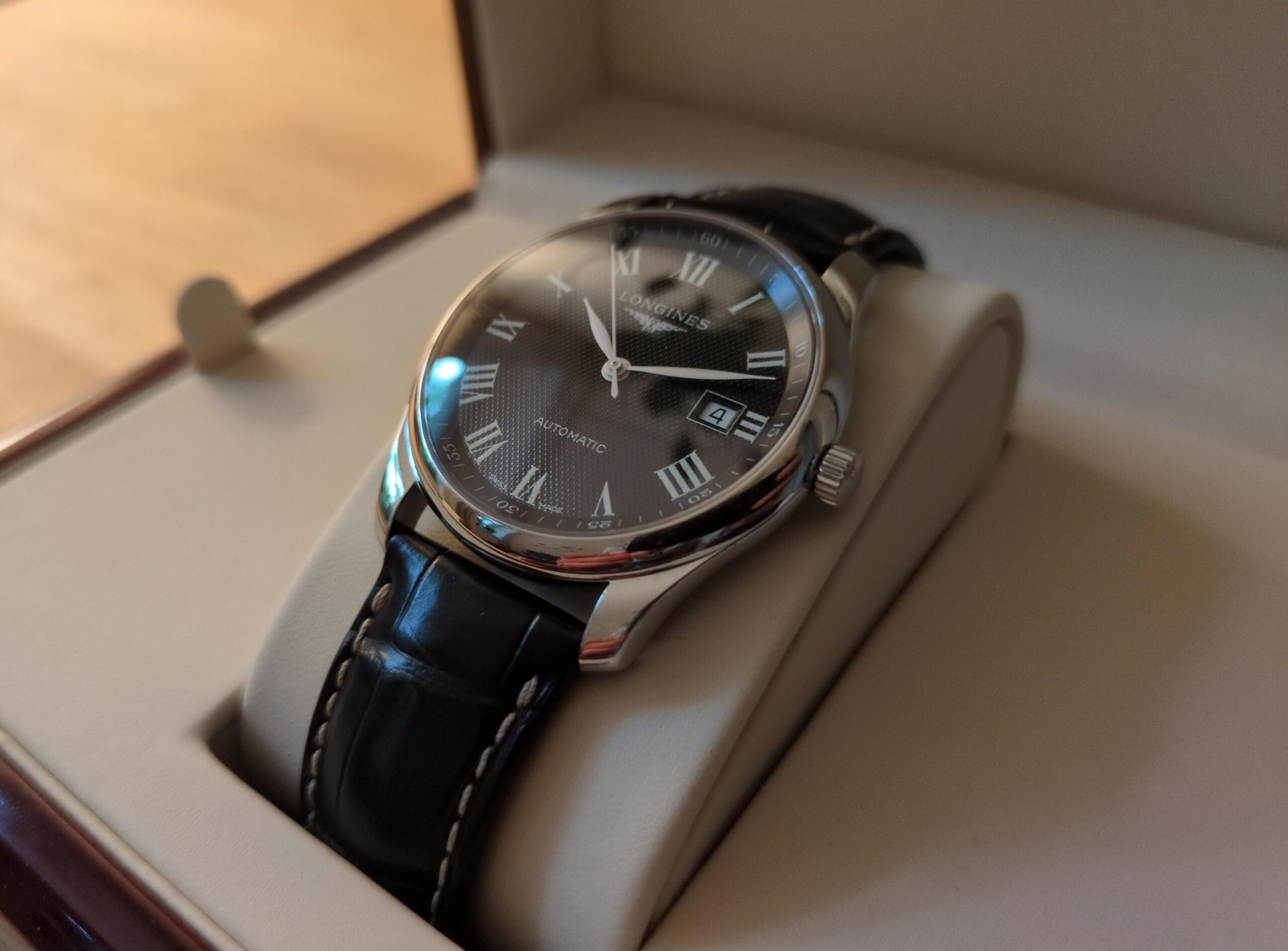 Ziffernblatt: Schwarz, versilberte polierte Zeiger, aufgesetzte römische Ziffern, Datumsanzeige